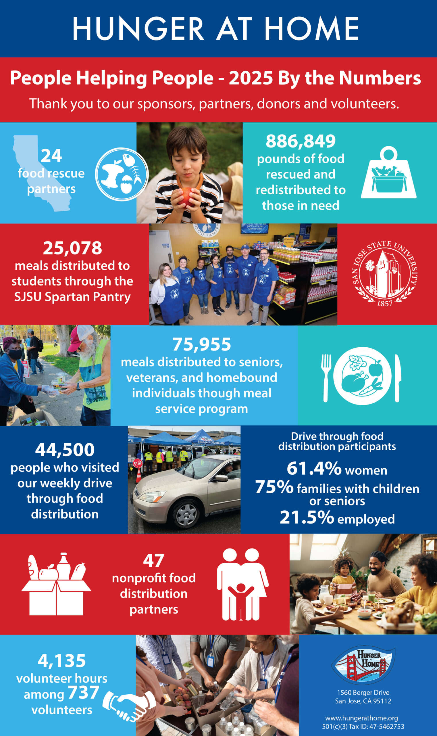 Hunger at Home is a leader in the fight against food insecurity in Silicon Valley, where tens of thousands of pounds of food are discarded daily, despite one in four people experiencing hunger.